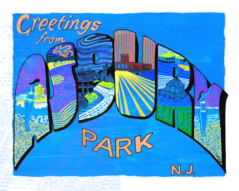 Greetings From Asbury Park, Blue is an original 11x14 painting from Gregory Attonito's Greetings from Asbury Park Collection. This series of paintings contains six original pieces created as homage to postcard art and all things Asbury Park, NJ